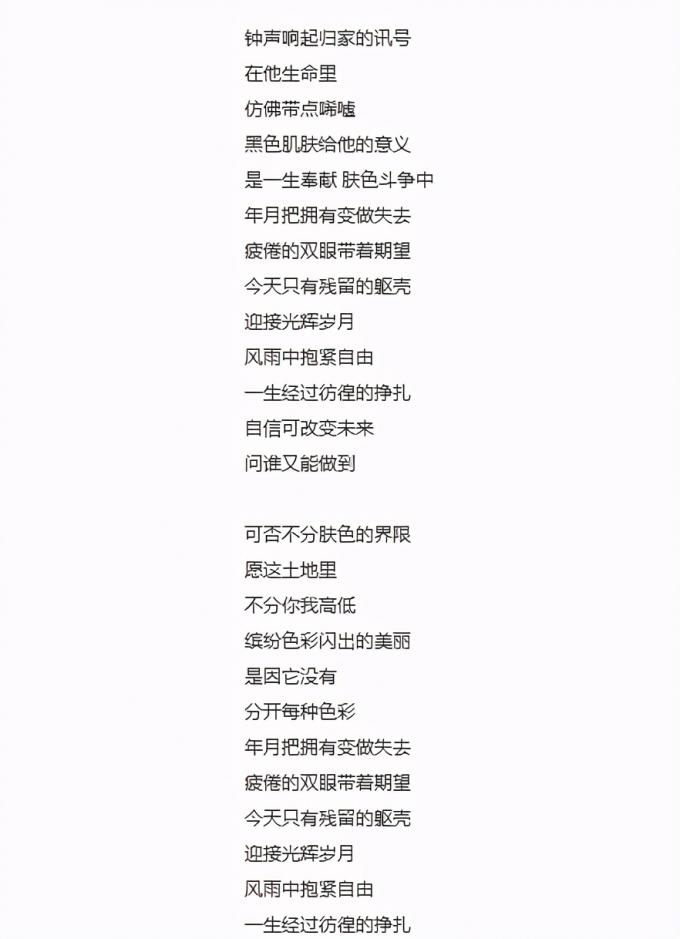 “……一生经过彷徨的挣扎,自信可改变未来,问谁又能做到,今天只有残留的躯壳,迎接光辉岁月,风雨中紧抱自由……”
