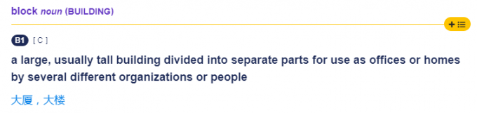 我们平时说的xxx大厦,用英语又该怎么说呢?在英语中,“block”这个词就可以指那种高楼大厦。我们平时用来上班或者办公的写字楼就可以说成 an office block。