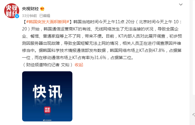 “说实话,当时并不知道发生了什么。没法上网,没法通话,整个人是懵的。”正如王先生所说,由于网络服务中断,韩联社、中央日报、韩国经济等在内的韩国主流新闻媒体的新媒体客户端均无法访问,甚至连涉事的网络服务商KT的官方通报都无法第一时间发布。